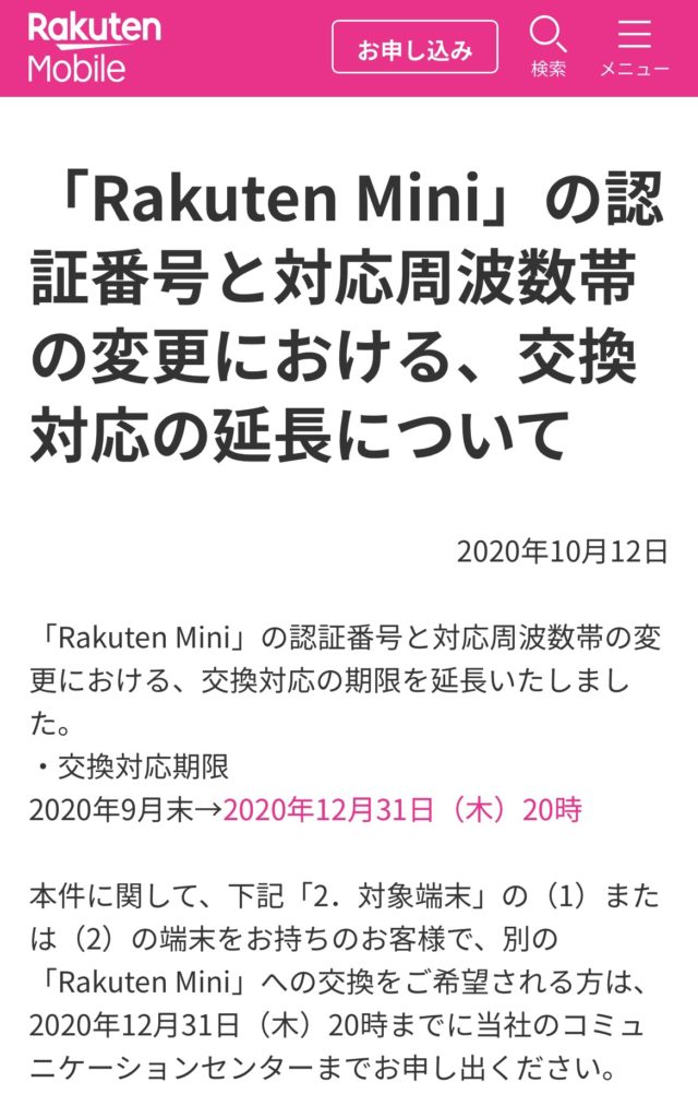 と、この交換対応の対象となる「Rakuten Mini」はというと、楽天モバイルのサイトより、下記ご案内します。